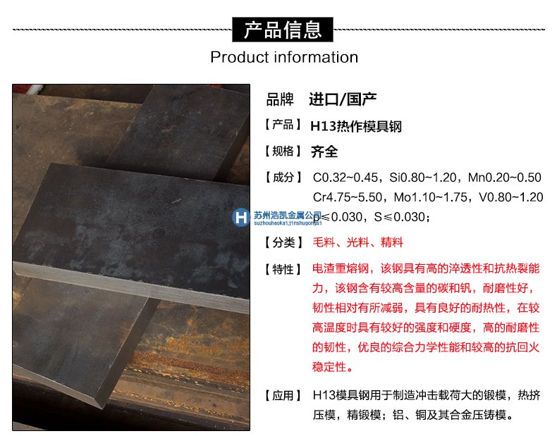 常用模具鋼性能用途、密度硬度和化學(xué)成分: 蘇州浩凱金屬材料有限公司大量銷售H13鋼板,提供H13鋼板價格新報價,關(guān)于H13鋼板的技術(shù)參數(shù)及H13鋼板性能_H13鋼板密度_H13鋼板材料材質(zhì)_H13鋼板規(guī)格型號_H13鋼板熱處理技巧等可以在線咨詢我們官網(wǎng)的在線客服。H13鋼板的化學(xué)組成元素與含量,亦可以咨詢我們。想了解更多H13鋼板用途的朋友可以在線咨詢我們的客服,我們竭誠為你提供優(yōu)質(zhì)的服務(wù)。 H13模具鋼簡介 H13是熱作模具鋼